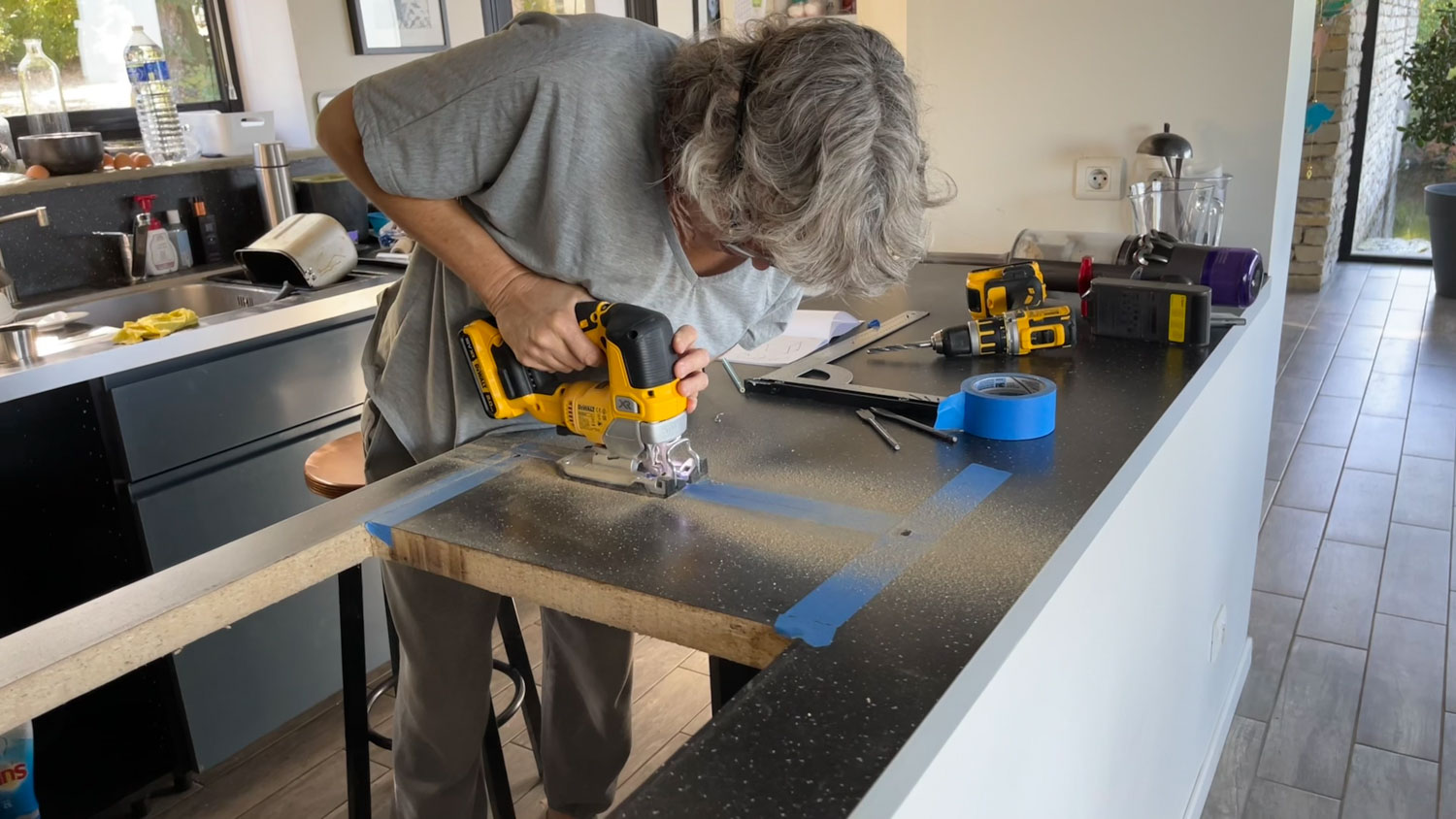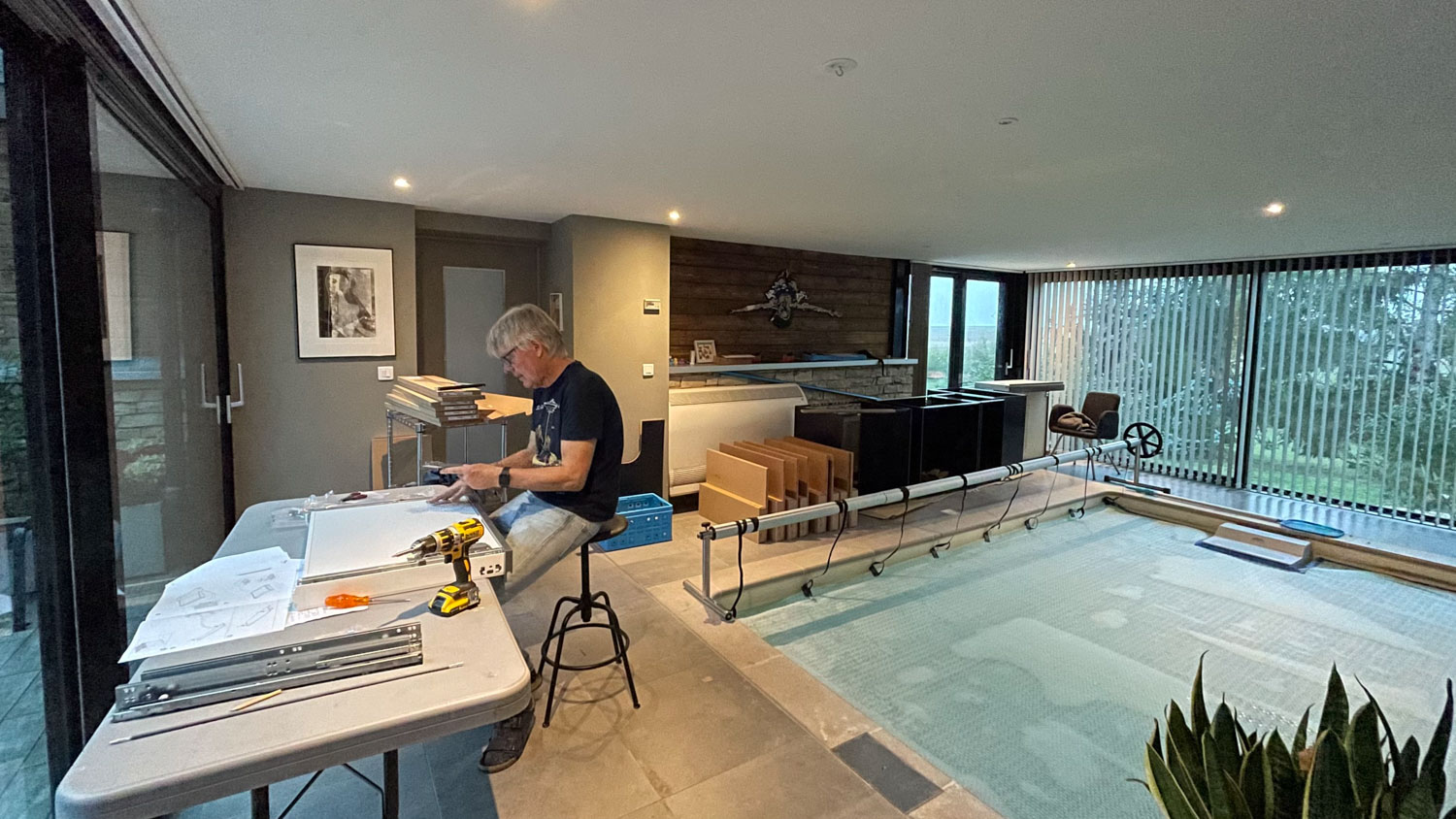 In juli kwam Els met Emily en Werner en hun kinderen Finn en Nox. Werner heeft een ontwerp van Petra uitgevoerd in staal wat hij kwam installeren. Hij heeft het prachtig uitgevoerd en we zijn er erg blij mee. Ook blij met zijn hulp om plintjes in onze keuken te maken, een werkje wat er al een paar jaar lag. Hoewel de Maasjes (gezin van Emily) in de gite bij Martin en Sophie sliepen, was het toch een enerverend weekje. Maar wel heel gezellig.