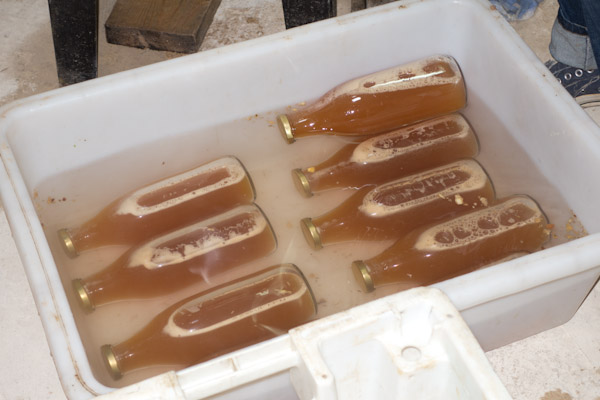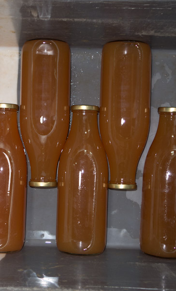 Daarna wordt het sap gefilterd en als laatste stap wordt het gefiltreerde sap in een grote ketel au-bain-marie gepasteuriseerd alvorens het in de flessen gaat.