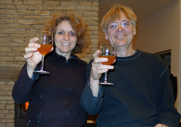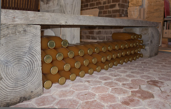 De telefoon gaat: onze Franse vrienden. Of we zin hebben in een appelpersfeestje in Girolles. Ja, we hadden het goed verstaan: appelpersfeestje! Leuk! Op naar Girolles. Aldaar aangekomen troffen we bij het atelier van de meestersteenhouwer Stephane Dupaquier een gezellige oploop aan. Een tiental mensen waren bezig met de verschillende verwerkingsstadia van ongewassen appel tot mooi gefilterd en gepasteuriseerd appelsap. Je kunt hier voor luttel bedrag (30 euro per dag) een compleet appelsapfabriekje op een aanhanger huren waarmee je zo’n 100 liter appelsap per uur kan produceren.