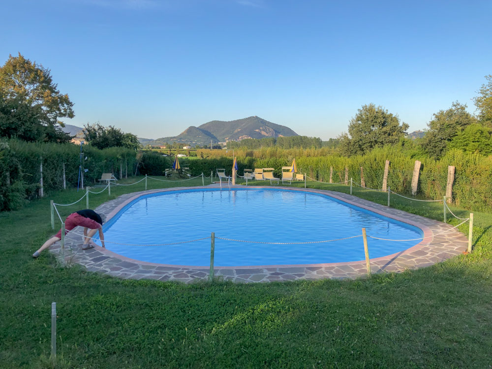 We streken ‘s middags neer in Montegrotto terme net ten zuiden van Padua bij een camping met een thermaal zwembad met olympische afmetingen en een goddelijke temperatuur van 33 graden. (http://www.sportingcenter.it) Heerlijk voor de rug natuurlijk. Wel een bizarre sfeer daar. Het was ook een soort kuurhotel dus er liepen allemaal oudjes in badjassen rond.