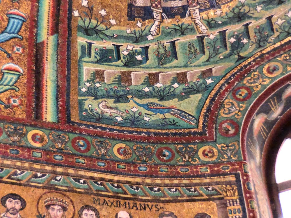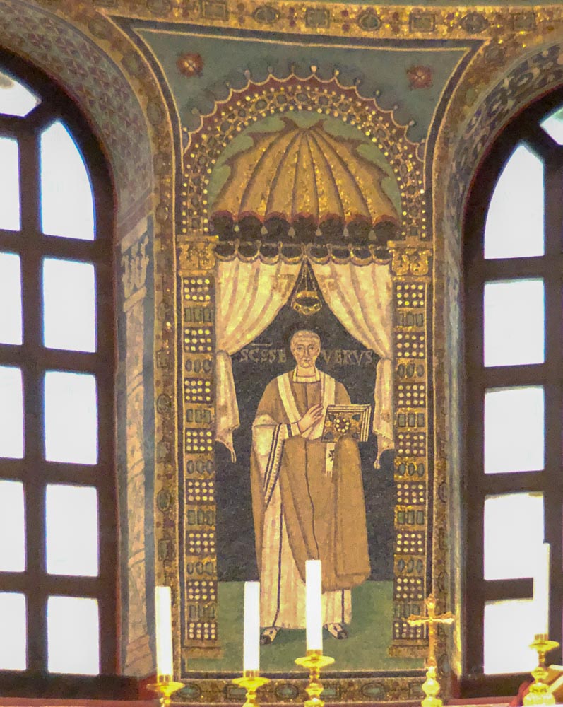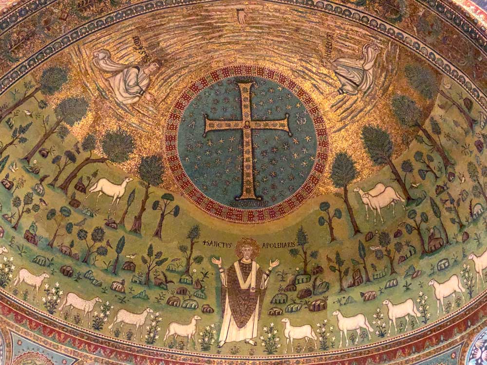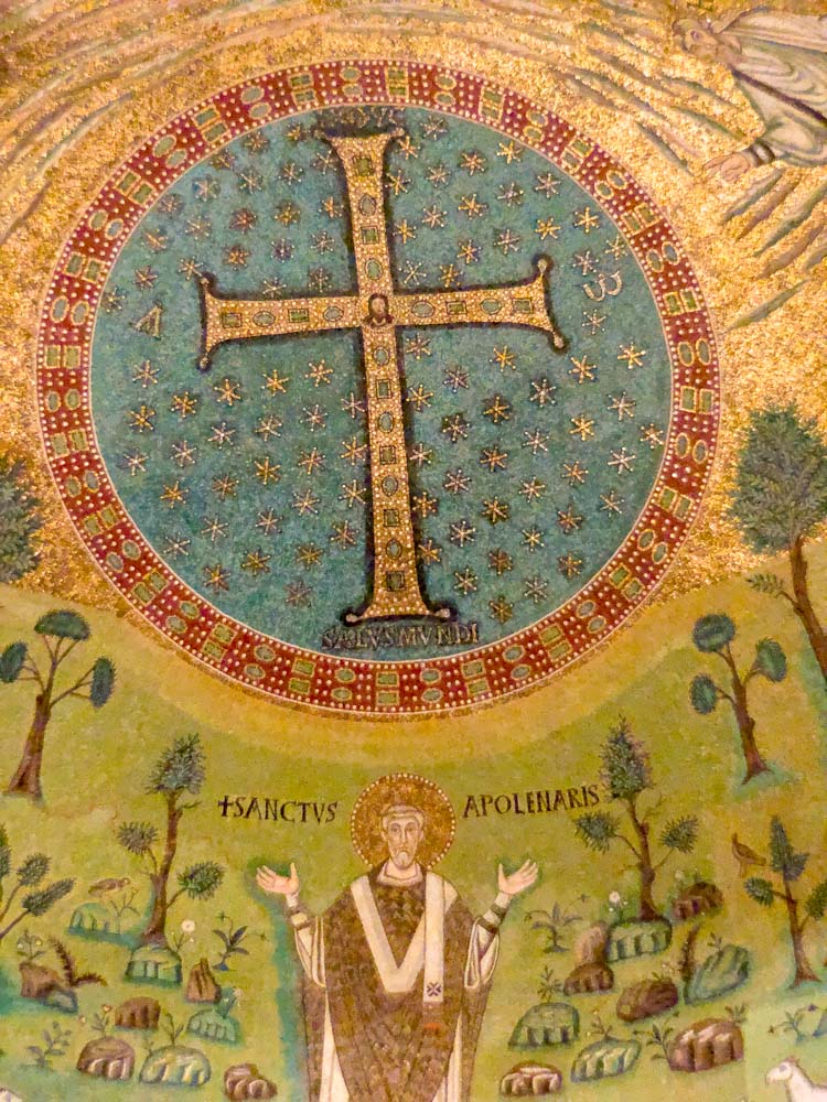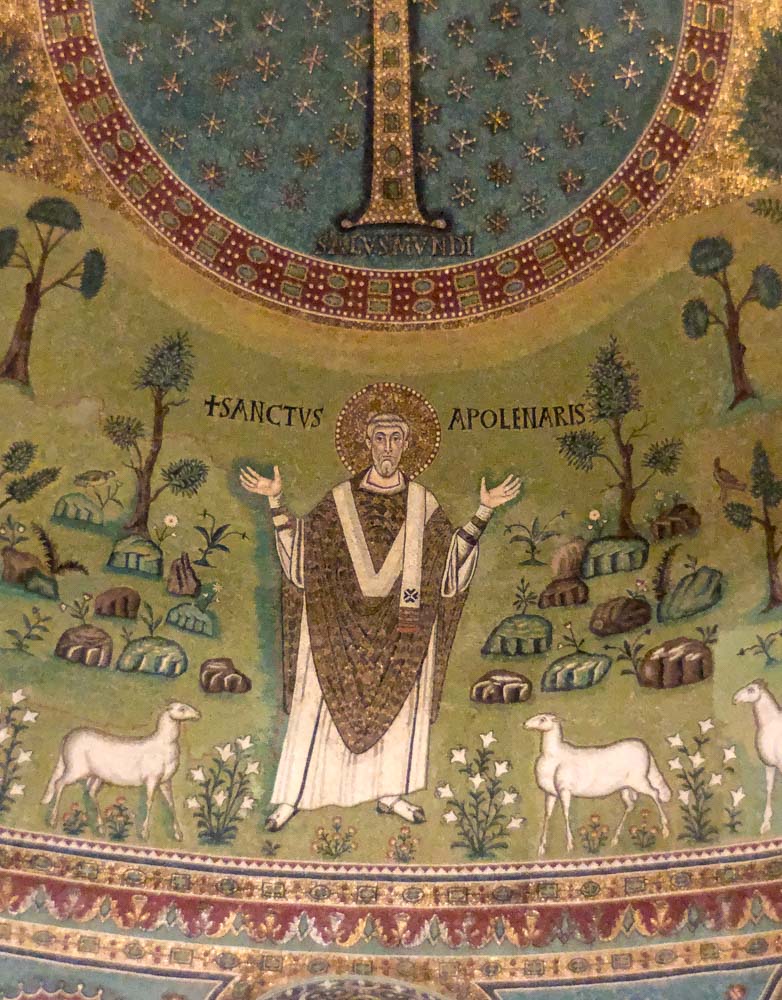 Omdat dit mozaiek-festijn in stijl af te ronden hebben we de Basilica van St. Appollinaire in Classe (vlakbij Ravenna) nog bezocht. Een indrukwekkende, alweer bakstenen, basiliek die op 9 mei 549 ook werd ingewijd door bisschop Maximianus en gewijd is aan Sint Apollinaris, de eerste bisschop van Ravenna en Classe. De basiliek is aldus van dezelfde tijd als de San Vitale in Ravenna, die een jaar eerder werd ingewijd!!