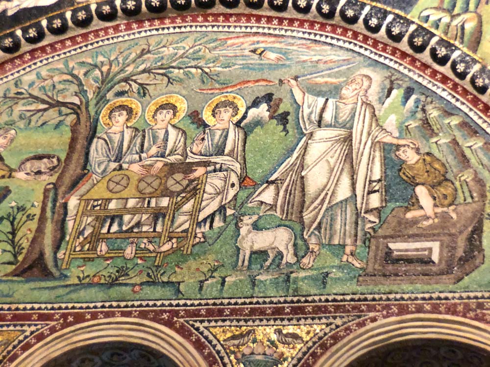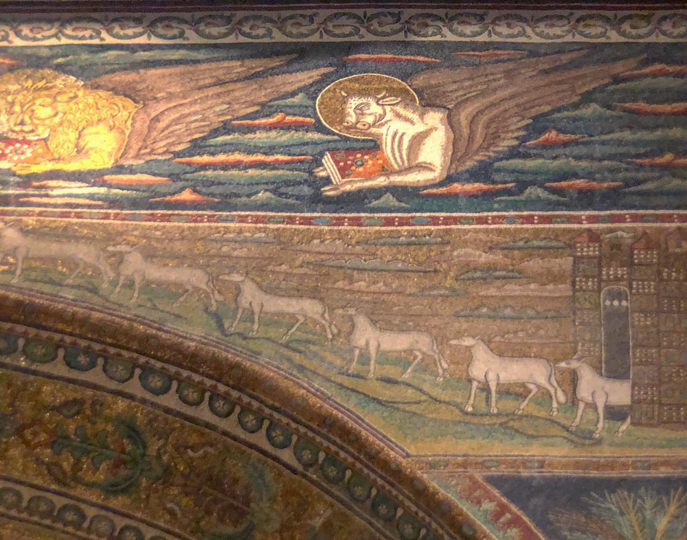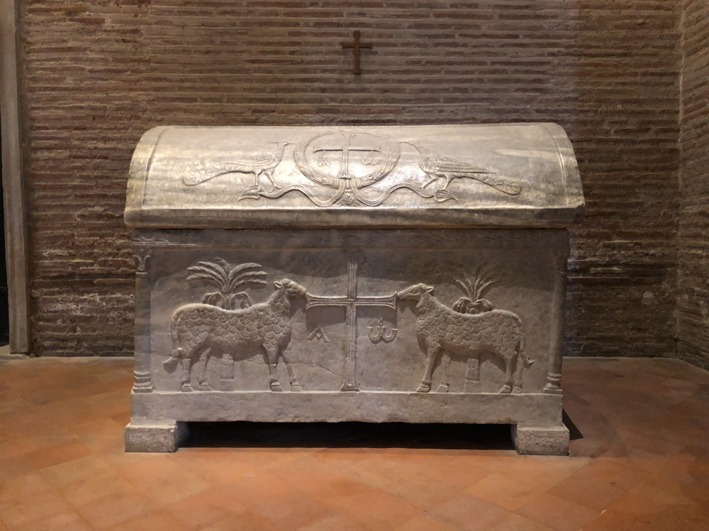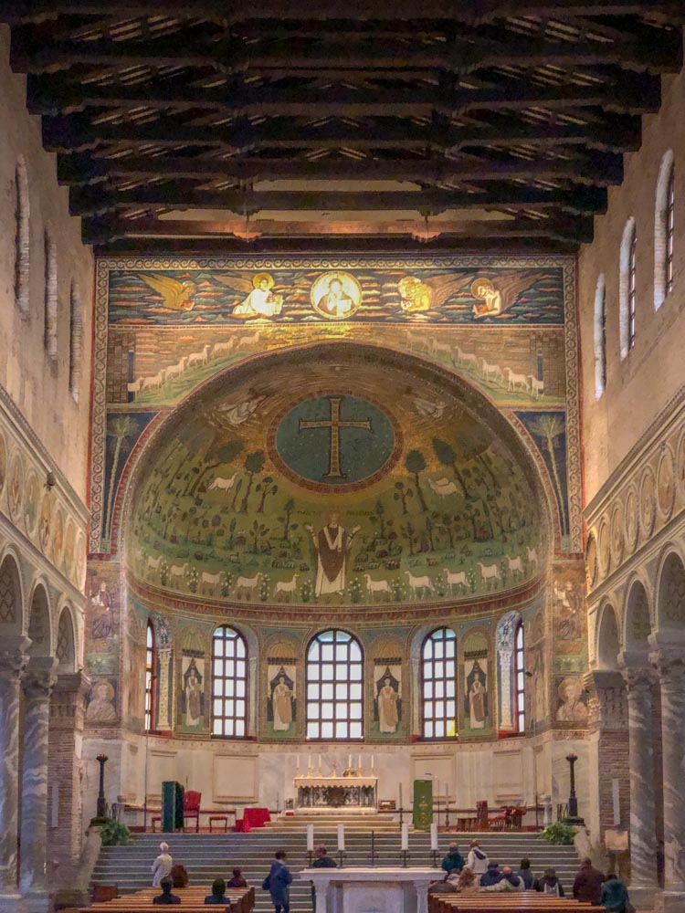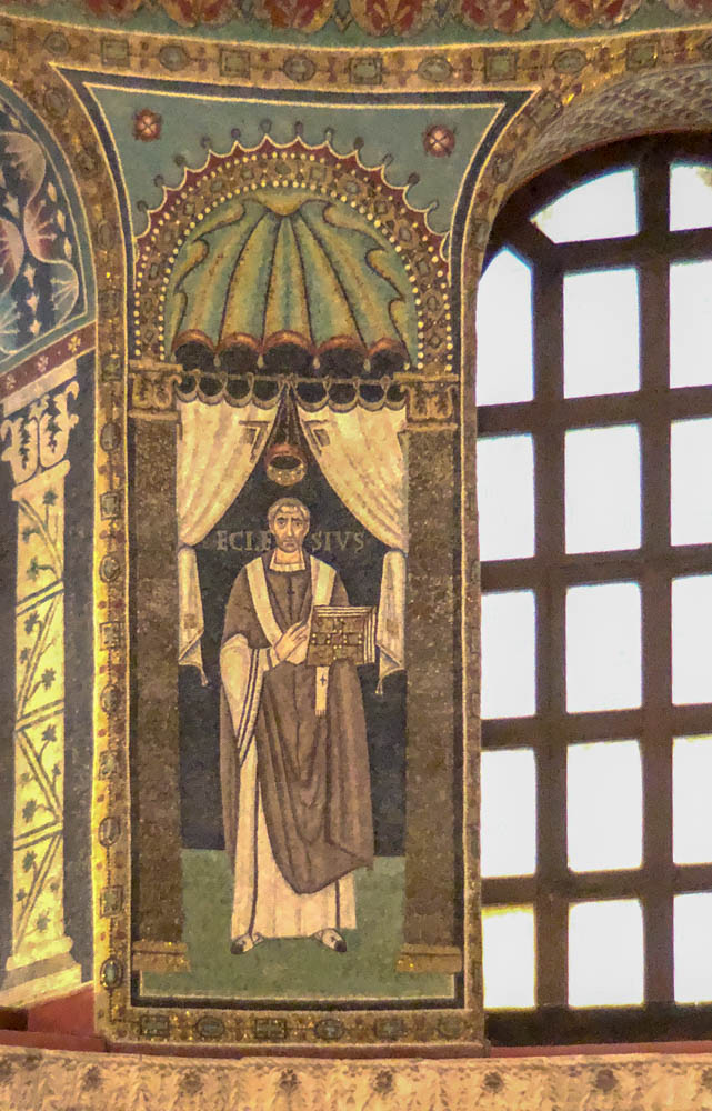 Omdat dit mozaiek-festijn in stijl af te ronden hebben we de Basilica van St. Appollinaire in Classe (vlakbij Ravenna) nog bezocht. Een indrukwekkende, alweer bakstenen, basiliek die op 9 mei 549 ook werd ingewijd door bisschop Maximianus en gewijd is aan Sint Apollinaris, de eerste bisschop van Ravenna en Classe. De basiliek is aldus van dezelfde tijd als de San Vitale in Ravenna, die een jaar eerder werd ingewijd!!