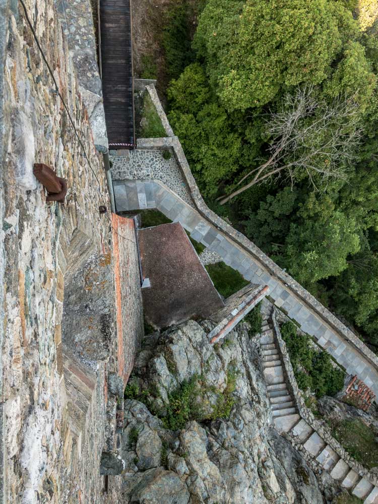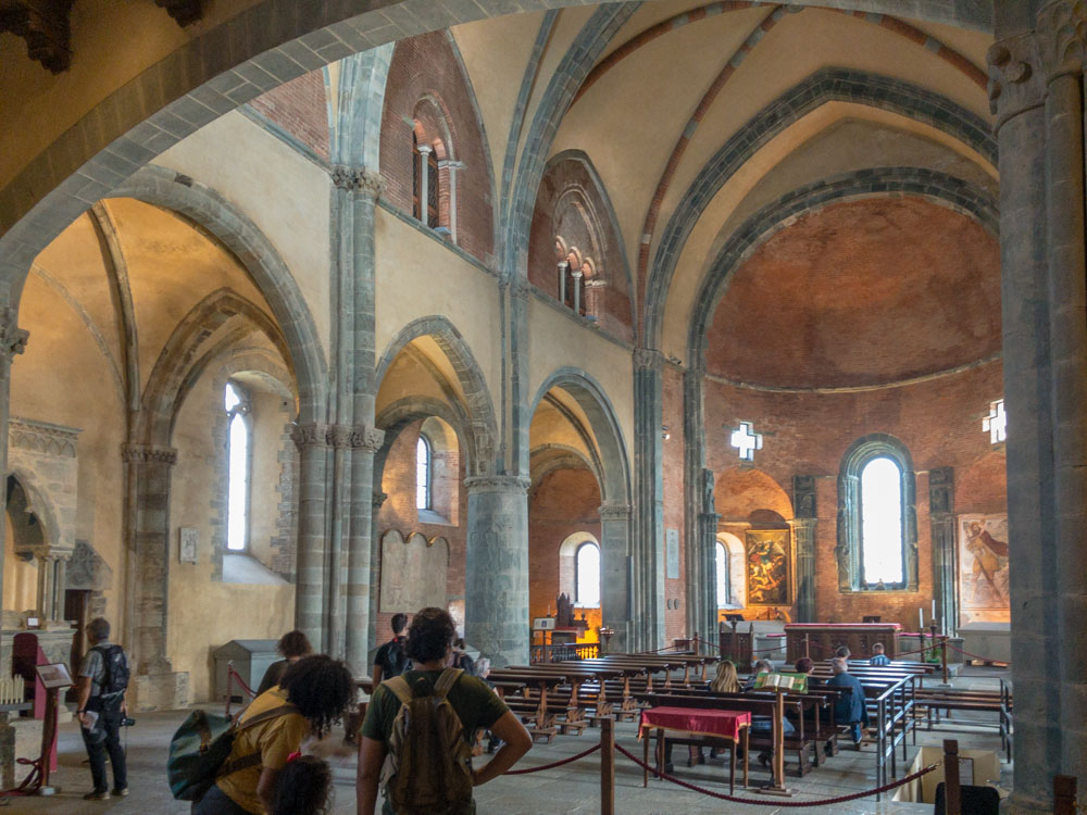In onze Michelingids van Noord-italie lazen we dat er een prachtig, hoog op een berg (Pirchiriano) gelegen klooster zo’n beetje langs de route naar Torino en we besloten dat te bezoeken. Via een relatief smal kronkelweggetje met haarspeldbochten naar de top van de berg, ook nog wel een uitdaging met busmans.