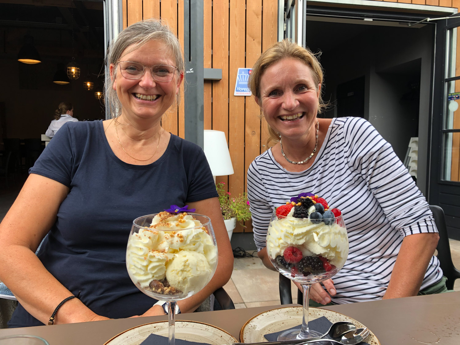 We lunchten op het terras van het nieuwe bezoekerscentrum en daarna hebben we nog met Carli en Yck een terrasje genomen in Hoenderloo. Die waren een fietstocht aan het maken rond het park. Dat was nog even gezellig.