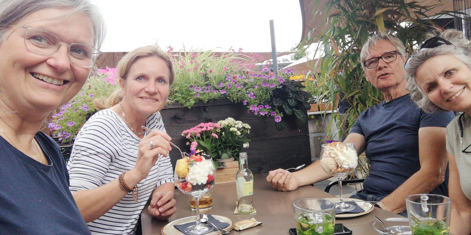 We lunchten op het terras van het nieuwe bezoekerscentrum en daarna hebben we nog met Carli en Yck een terrasje genomen in Hoenderloo. Die waren een fietstocht aan het maken rond het park. Dat was nog even gezellig.