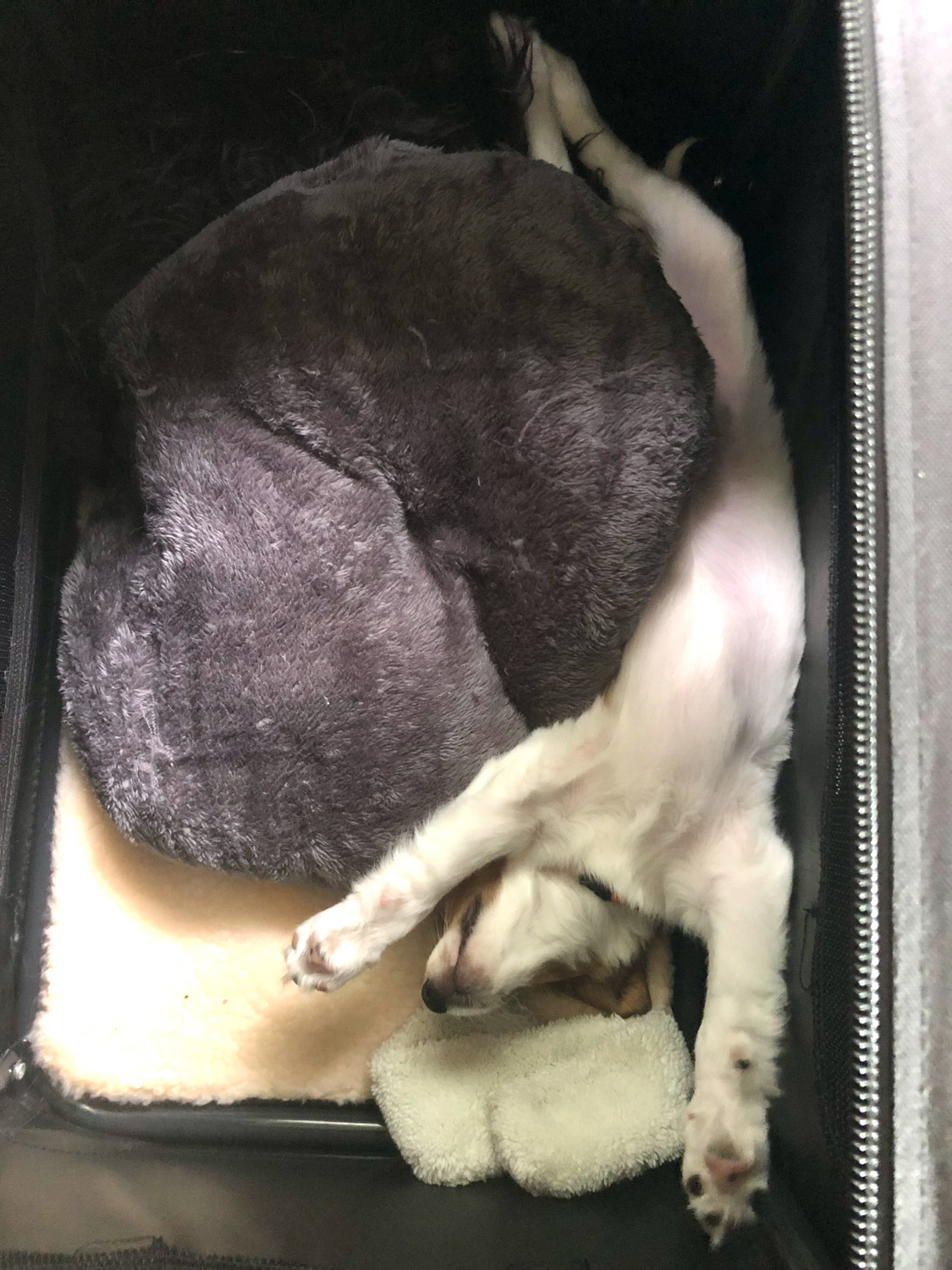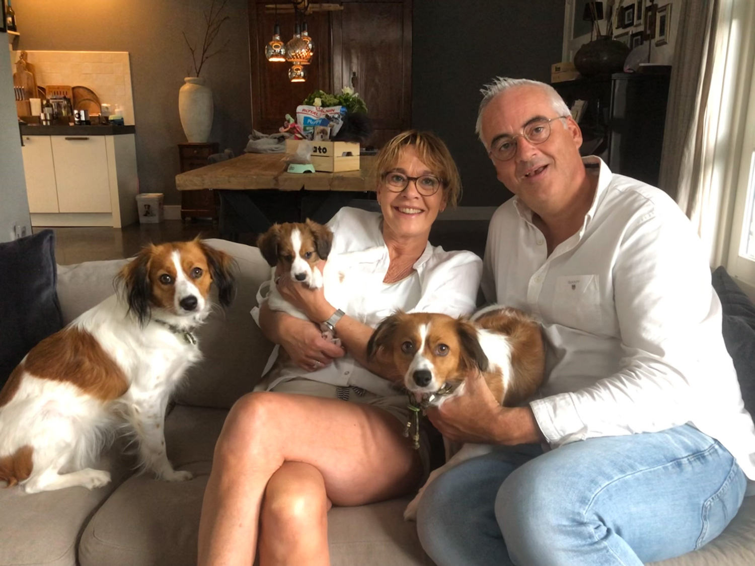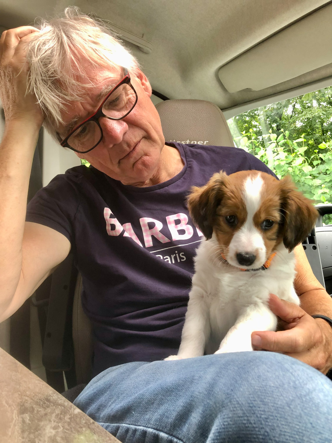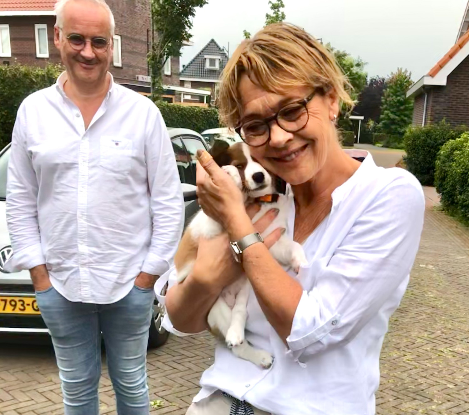 Zondag 22 augustus. Geen zon en vroeg op want vandaag gaan we Cato halen! Om 9 uur waren we bij Gea en Arie. Die zaten al klaar met koffie en appeltaart. Pleun is gisteren al opgehaald, dus Cato is de tweede. Er stond een kratje op tafel met Cato’s naam erop en, behalve het bestelde voer, allemaal goodies erin. Entingsboekje, kluifje, speelgoed en een dagboekje met verhaaltjes en foto’s zo leuk! Nog een laatste foto met Gea, Arie, Saar en Pien en toen was het zover. Catootje werd in de reisbench gezet die op de bank stond. We waren de hoek nog niet om of ze begon hard te janken. Ik ben toen naast haar gaan zitten en met mijn hand een beetje gerustgesteld. Toen is ze gaan slapen.