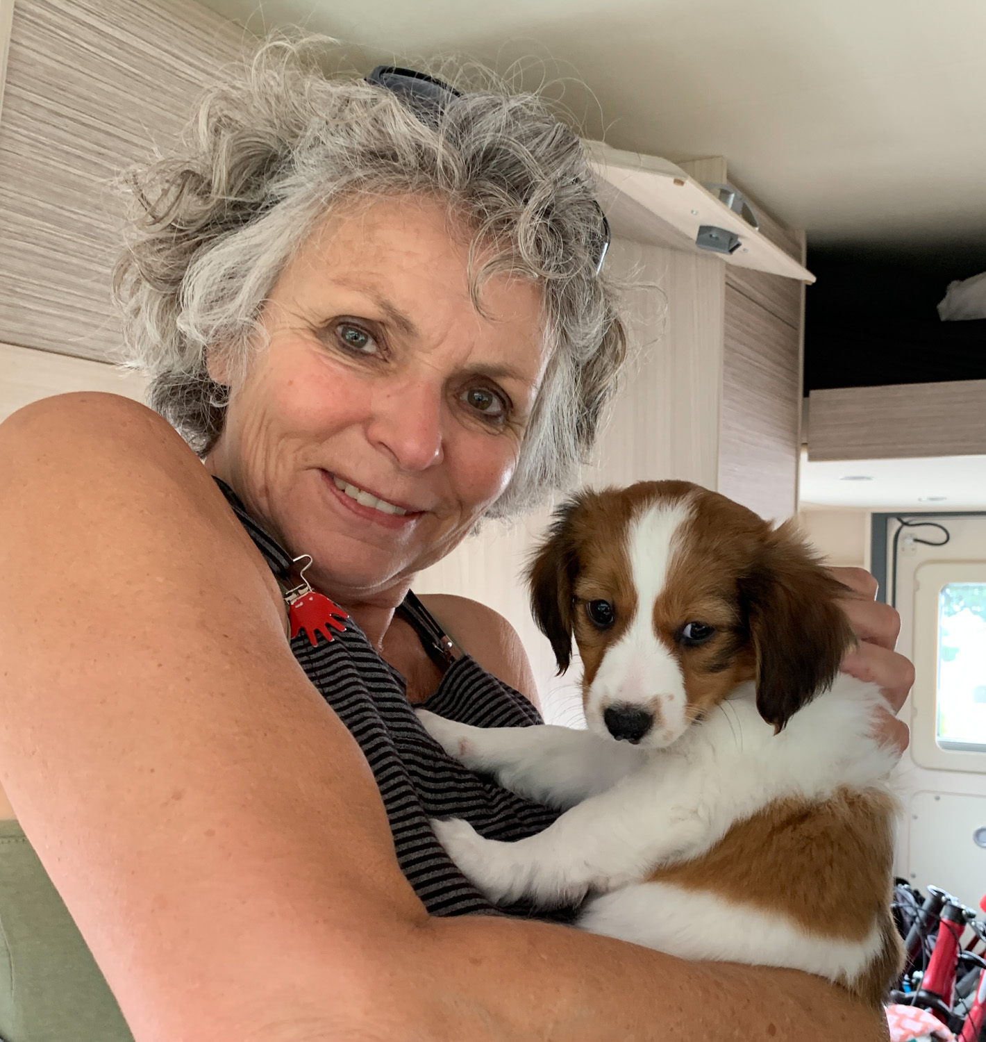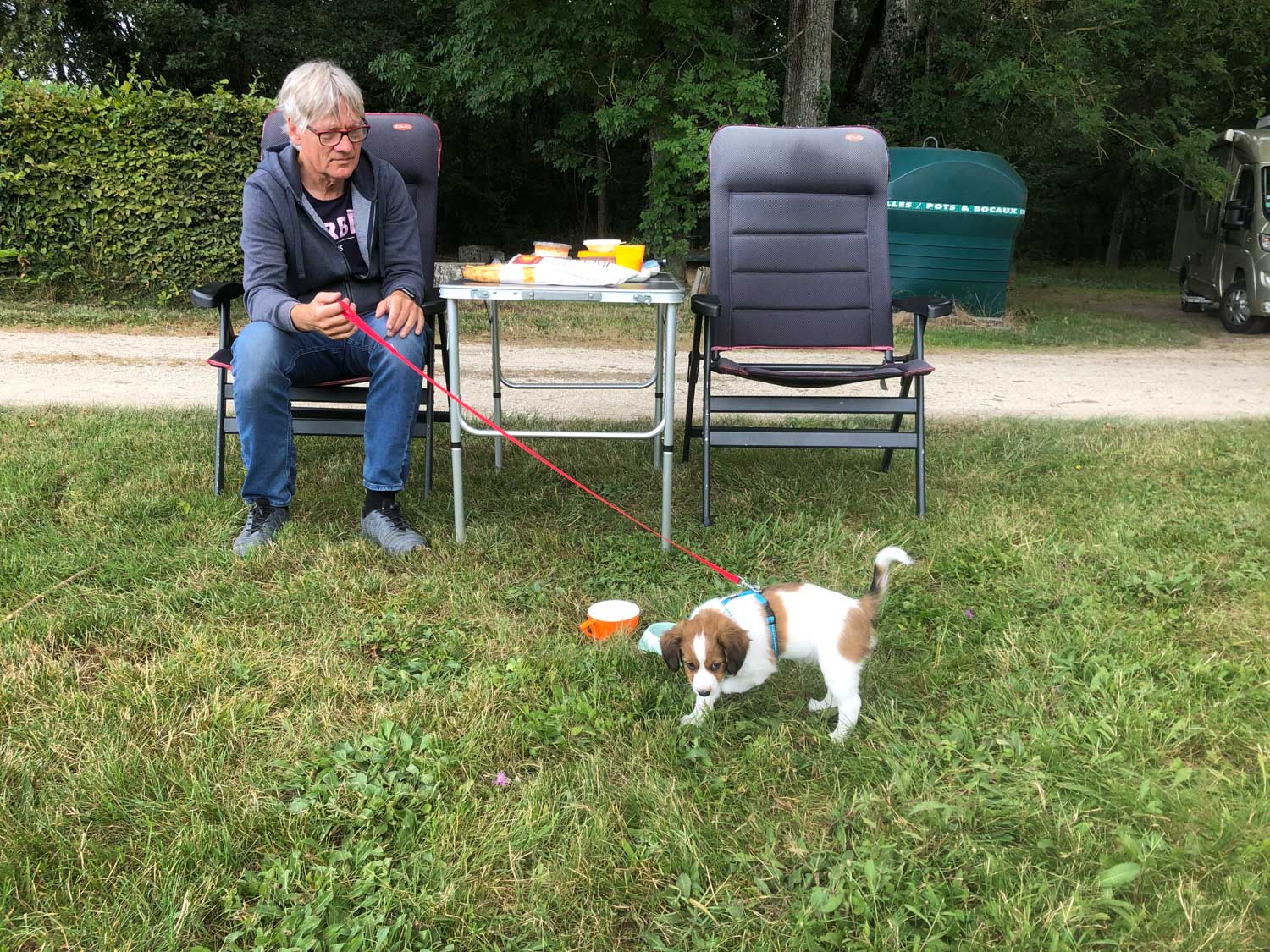 Onderweg heeft Cato keurig in de bus op haar trainingsmatje een plas gedaan en ze heeft ook brokjes gegeten. Ze vond het allemaal erg spannend en ze oogt heel ontspannen. Ze zwaait voortdurend met haar staartje. Ondanks dat het enorm regende besloten we toch in Laon te stoppen om een nachtje over te blijven. Toen we eenmaal stonden scheen de zon en konden we buiten zitten. Wat vond Cato dat ook weer leuk en ze heeft nu al geleerd een beetje aan de de riem te scharrelen. Het scheelt ontzettend dat ze al een halsbandje gewend was. Ik heb nog lekker even gezwommen in het verwarmde zwembad.