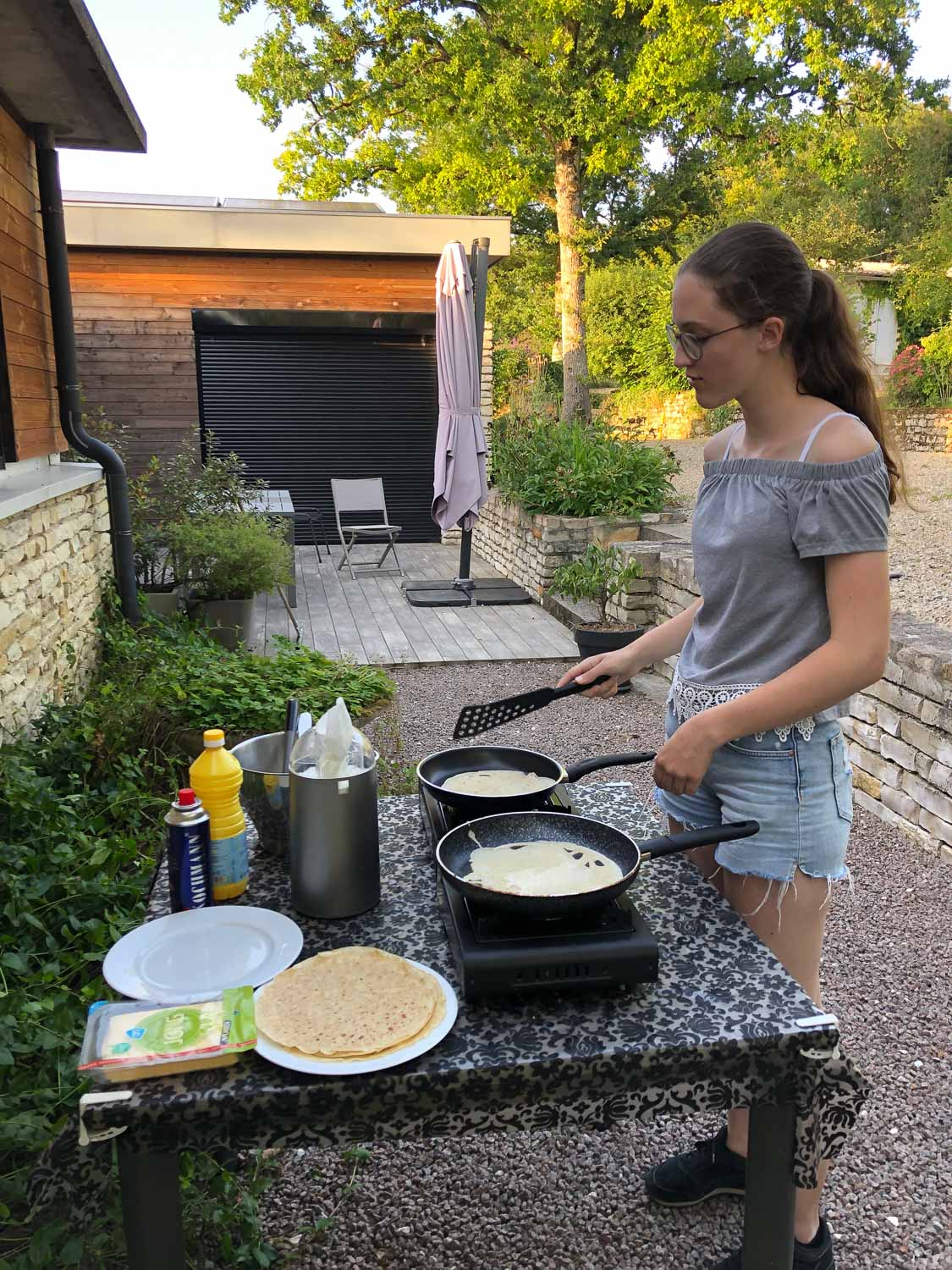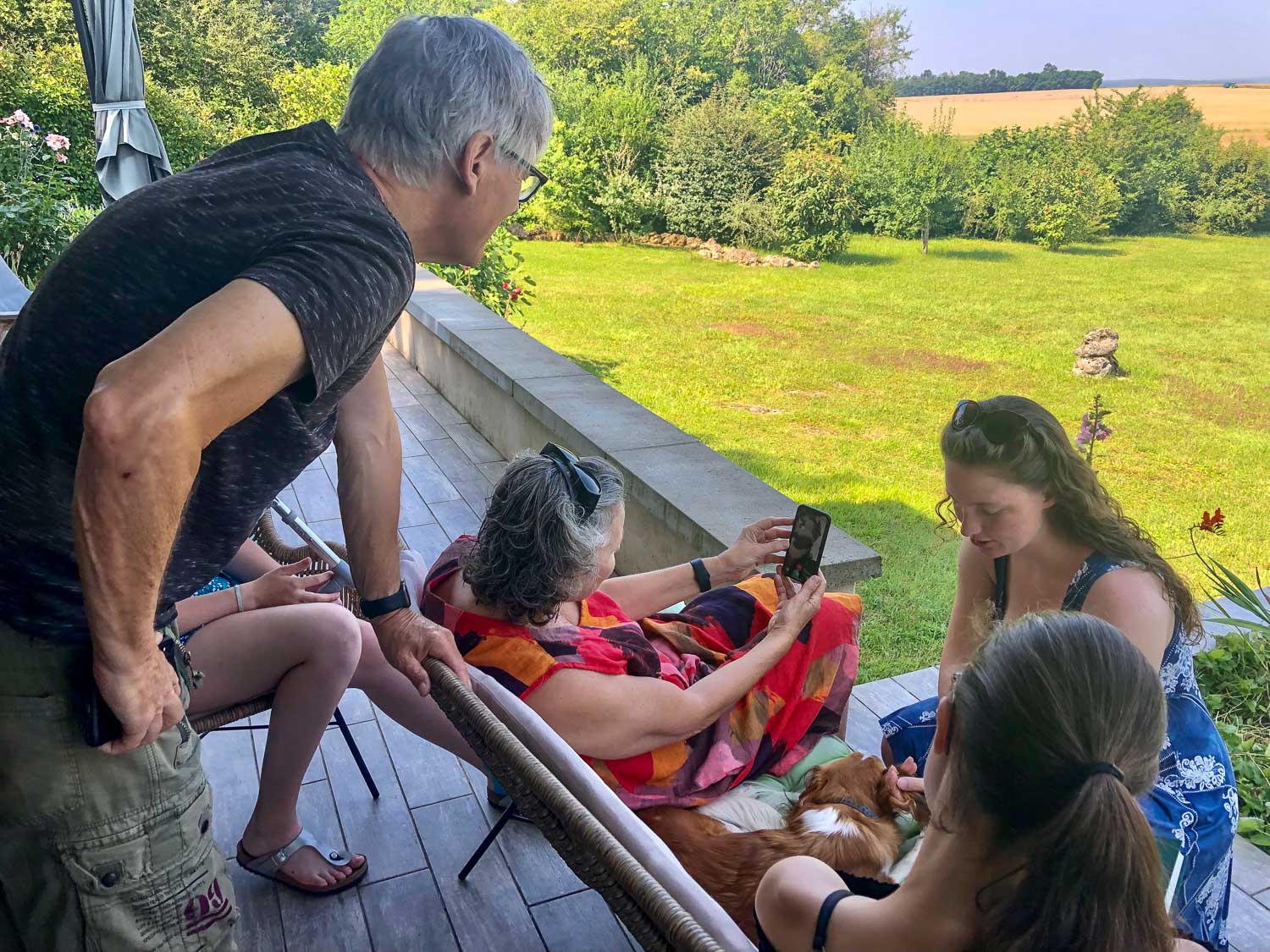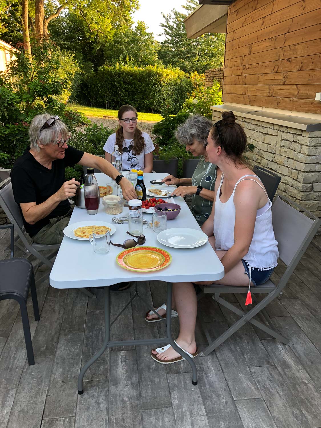 Rosemarijn, Sterre, Lilly, Sarah-Faye en hond Noor kwamen drie weken zomer vieren met ons in Avigny van 15 juli tot 9 augustus. Het was een heerlijke tijd met elkaar. We hebben gekletst, geluierd, getuinierd, geklust, kunst gekeken, gelezen, gefietst, gekayakt, gezwommen, gekookt en heel lekker gegeten, gefotografeerd, geblogd, Olympische spelen gekeken (vooral paarden!), prachtige zonsondergangen gekeken vanaf het terras, uitstapjes gemaakt en heel veel spelletjes gedaan, waaronder  buitenactiviteiten zoals croquet, het paaltjesspel en jeu de boules. We genoten van Noor en buurhond Dolly, die dagelijks op bezoek kwam. Cato, onze aankomende gezinsuitbreiding, was ook al een beetje aanwezig door de vele foto’s en video’s die Gea dagelijks stuurde. Roos’ project deze zomer was het uitzoeken van Petra’s stamboom.