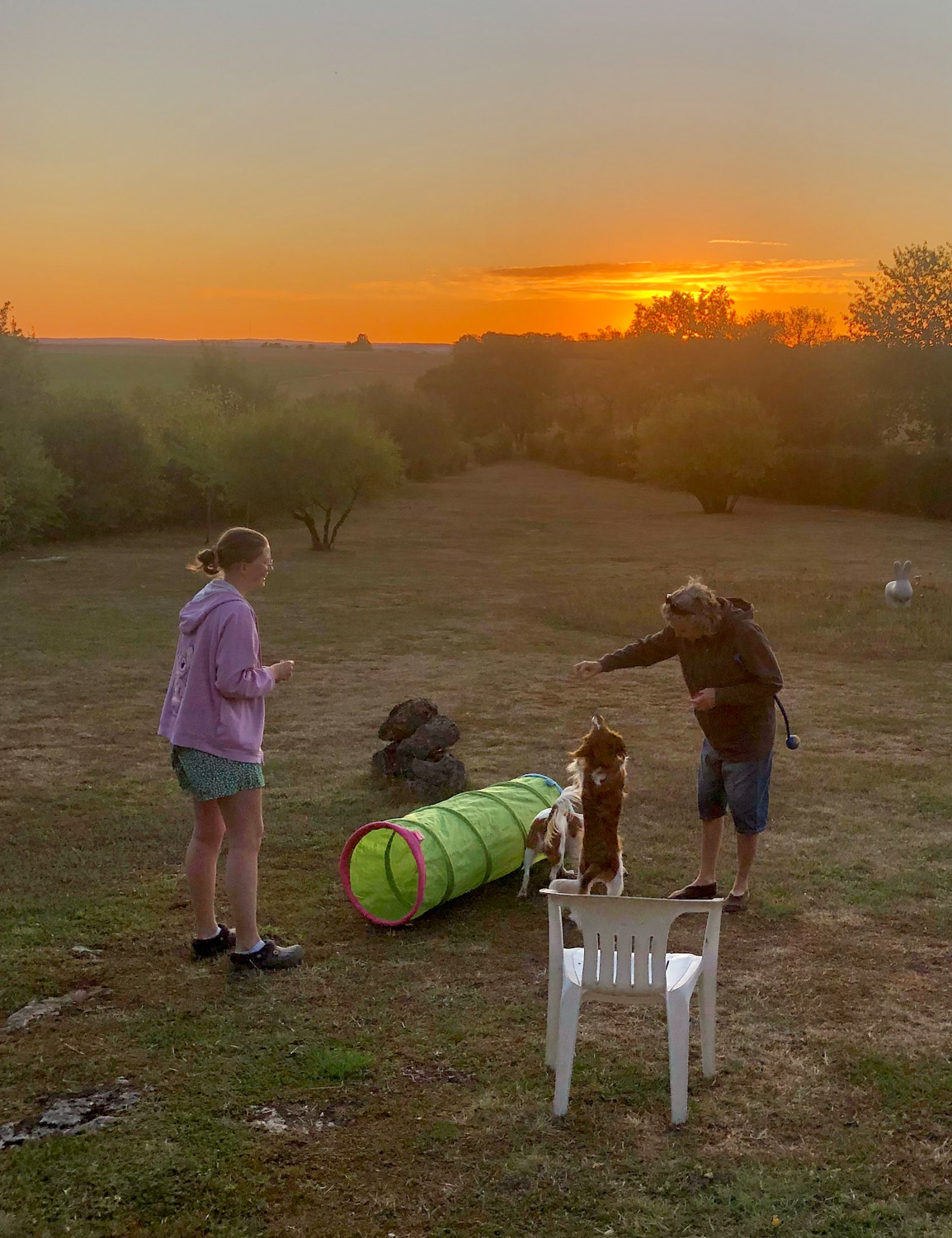 De wandelingen met de zusjes Cato en Noor waren niet te lang vanwege de hitte. Maar ‘s avonds tegen zonsondergang gingen ze met Petra en Faye naar de wei, waar uitgebreid gespeeld, geapporteerd en gerend werd. De rest keek geïnteresseerd toe, genietend van de prachtige zonsondergangen.