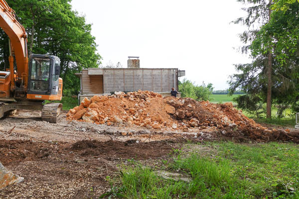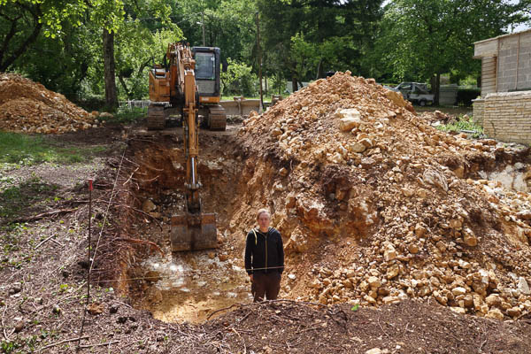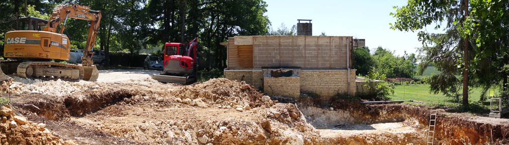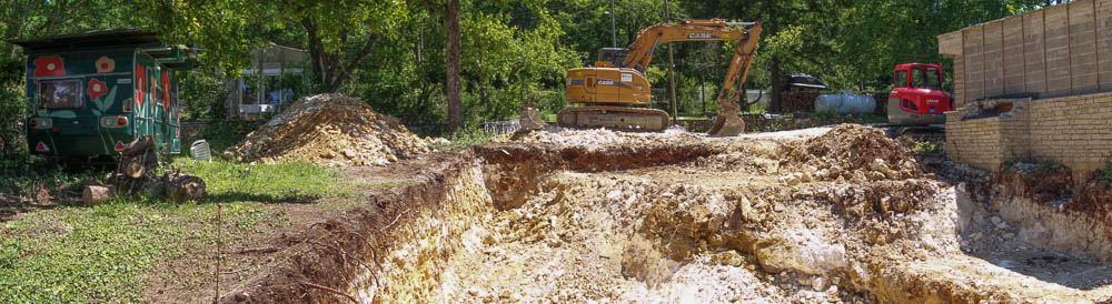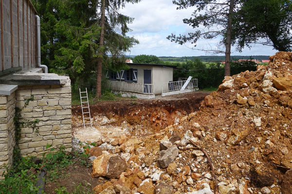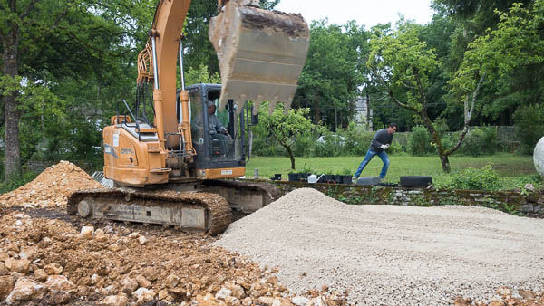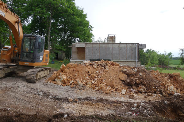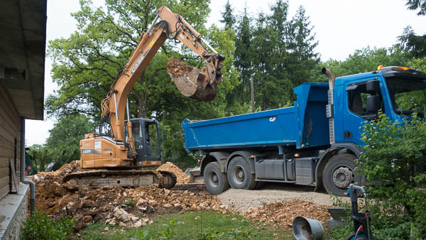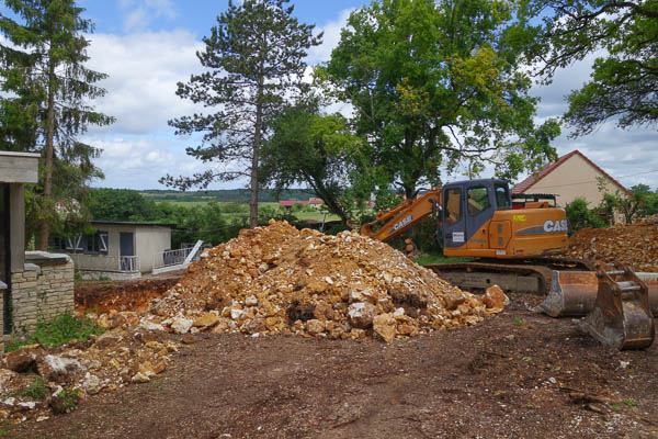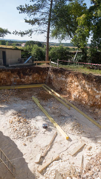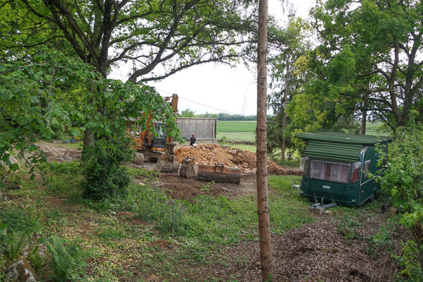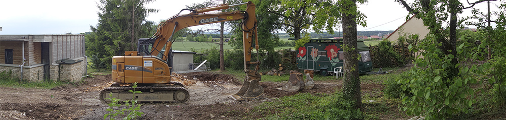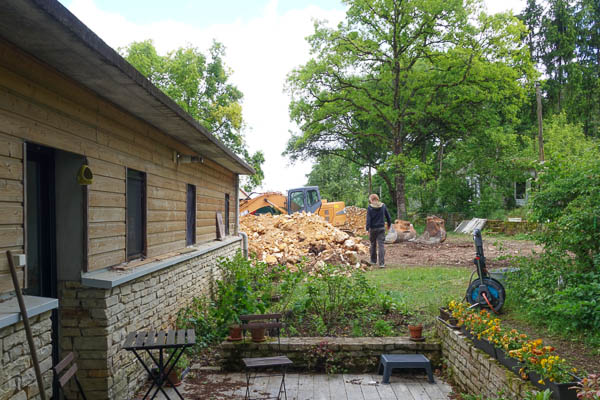 En verder gaat de verbouwing ook gestaag door. Het gat is ondertussen ‘klaar’ en wordt nu gevuld met een houten bekisting voor het storten van het fundament. Ook is er een mega schaftkeet in de tuin geparkeerd en is de pneumatische hamer door ander speelgoed vervangen.