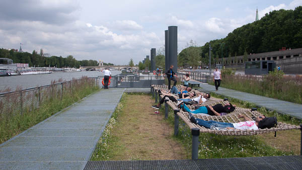 Onze Franse vrienden Martin en Sophie hadden ons begin juli voor een paar dagen uitgenodigd in Parijs. We hebben een paar mooie tentoonstellingen bezocht, lekker gegeten, veel gefietst en we hebben wat rondgehangen bij de nieuwe Parijse attractie, Les Berges. Waar tijdens Parisplages elke zomer al wat kades worden afgesloten voor het strandevenement, zijn nu structureel een paar kades omgetoverd in wandel en recreatiegebieden met onder andere drijvende tuinen waar de Parijzenaars zich kunnen ontspannen.