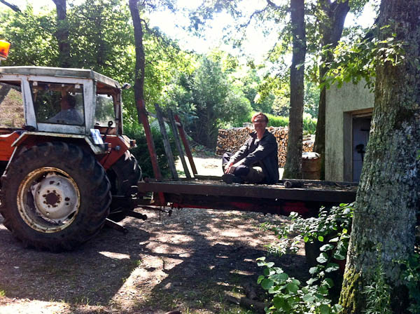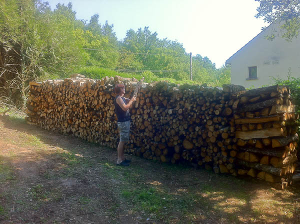 We waren nog niet terug in Avigny of buurman Jerome stond voor de deur: ’t was de hoogste tijd om het hout dat Hans afgelopen winter heeft gekapt, gezaagd en gekloofd op te halen uit het bos. Na 2 ochtenden heen en weer rijden met de tractor van Jerome ligt er nu zo’n 20 kuub hout op ons terrein. Het moet nu eerst minimaal 2 jaar drogen voor we het kunnen gaan gebruiken, dus voorlopig zullen we nog hout moeten kopen. Het smaakte toch naar meer dus Hans heeft zich inmiddels al weer ingeschreven voor zijn volgende Affouage.